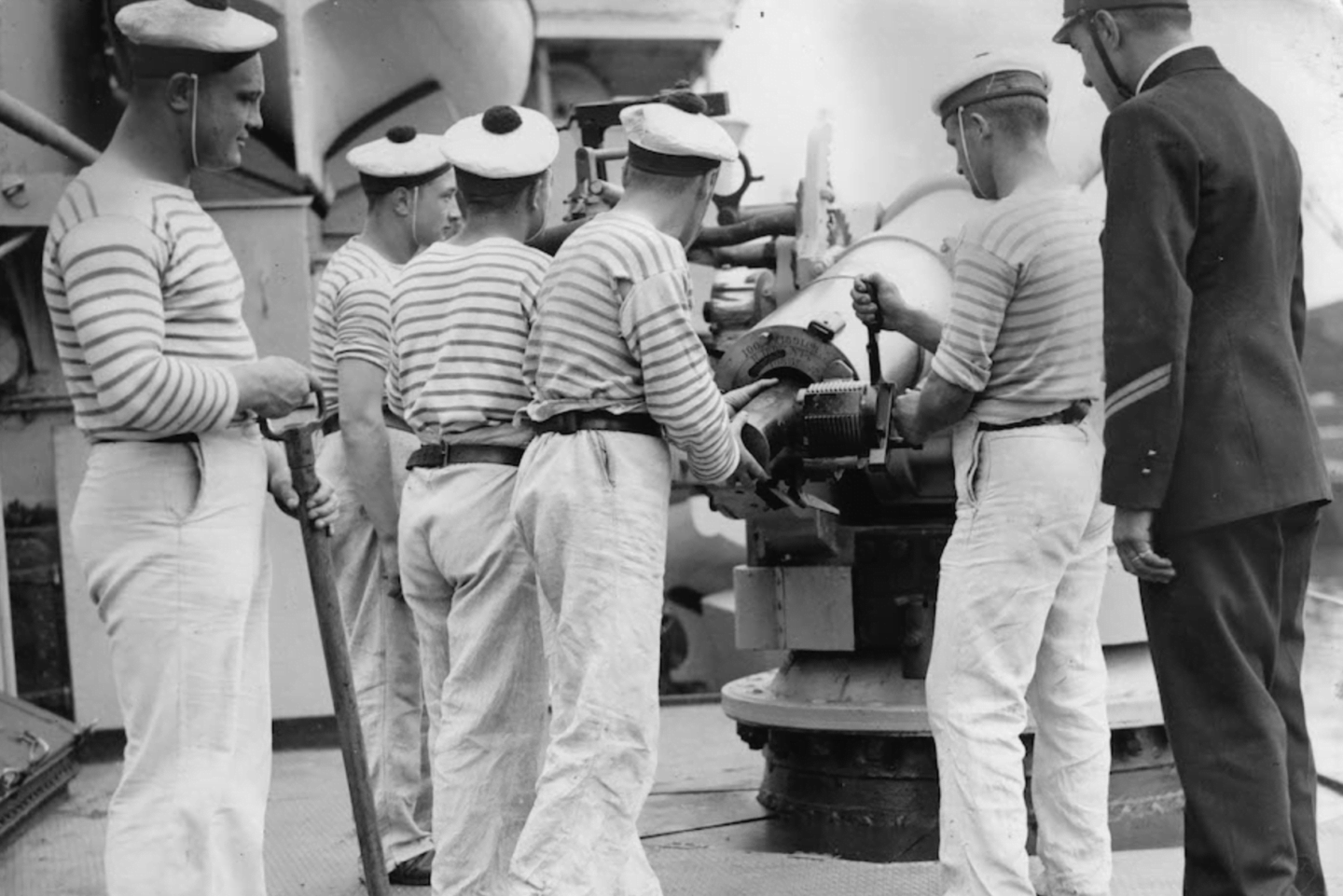 Моряки носили форму с горизонтальной полосой по нескольким причинам: во-первых, было легко заметить упавших за борт товарищей. Форму легко было быстро надеть, потому что она была без пуговиц и символизировала более низкий статус по сравнению с капитаном и старшими офицерами.